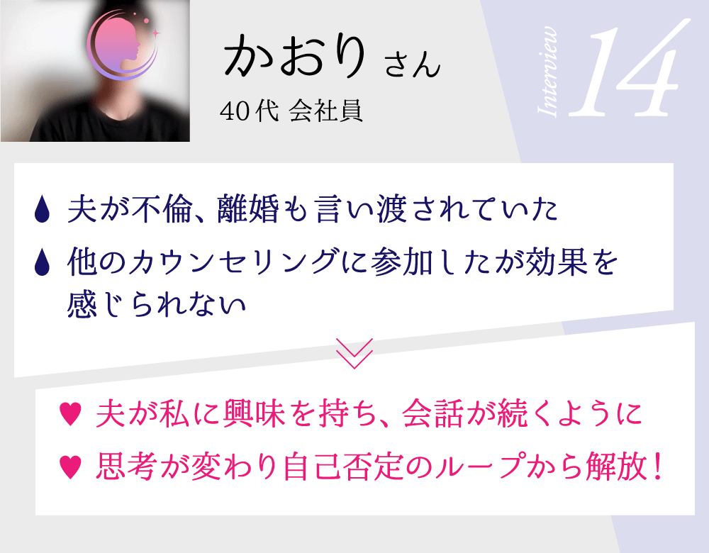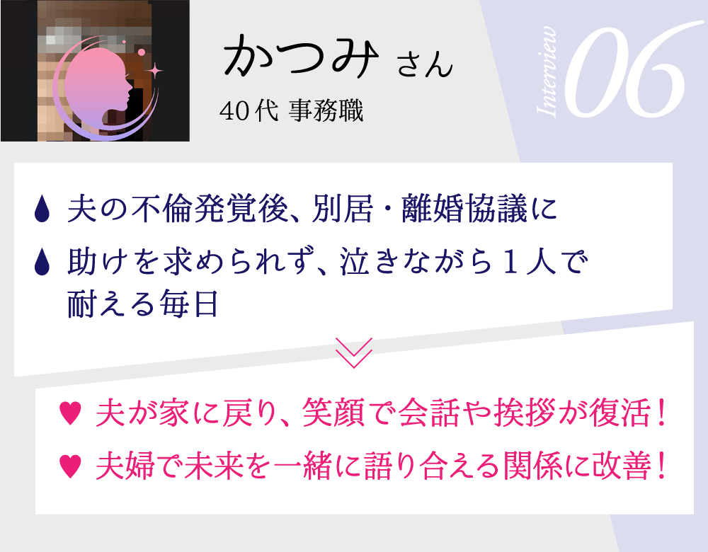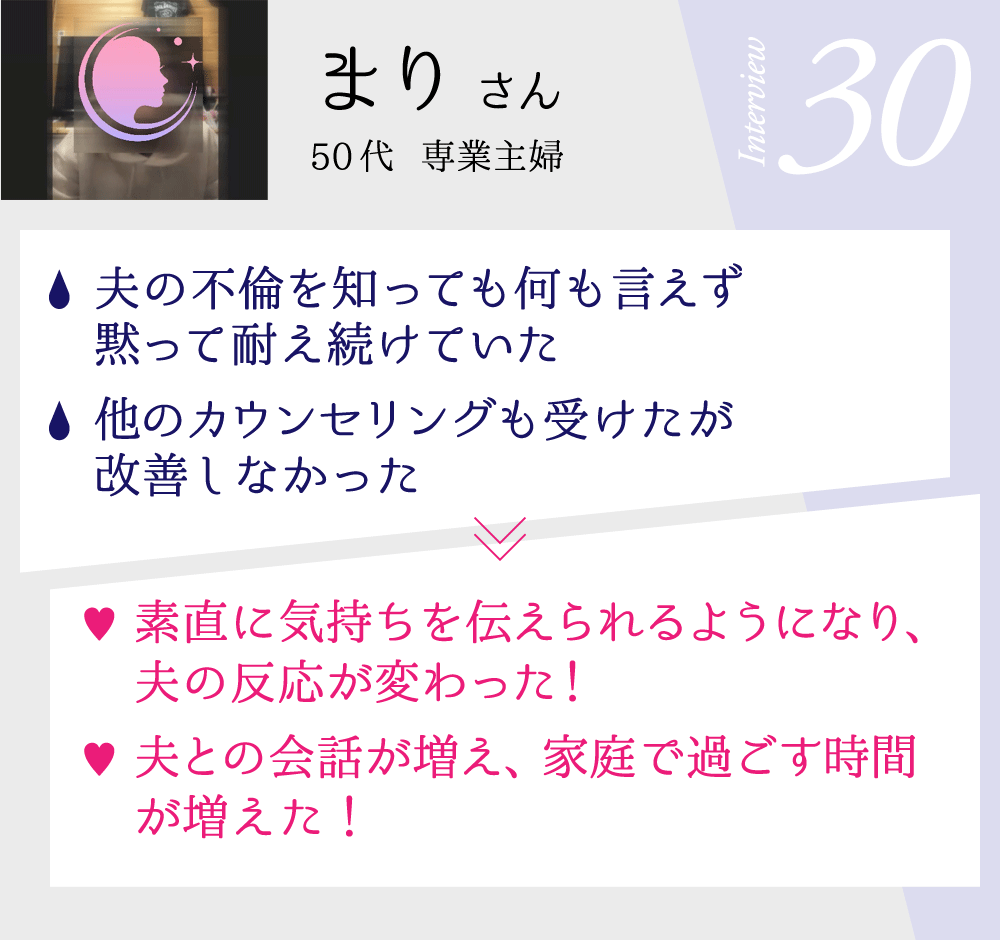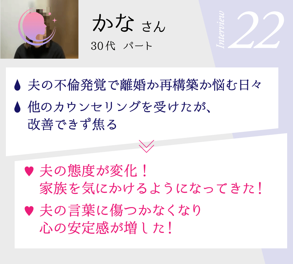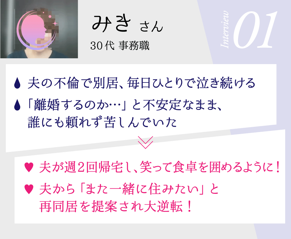 別居・不倫・離婚危機など、深刻な状況からの再構築に成功した事例が多数。