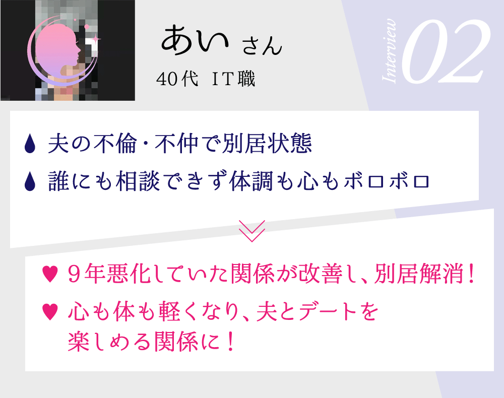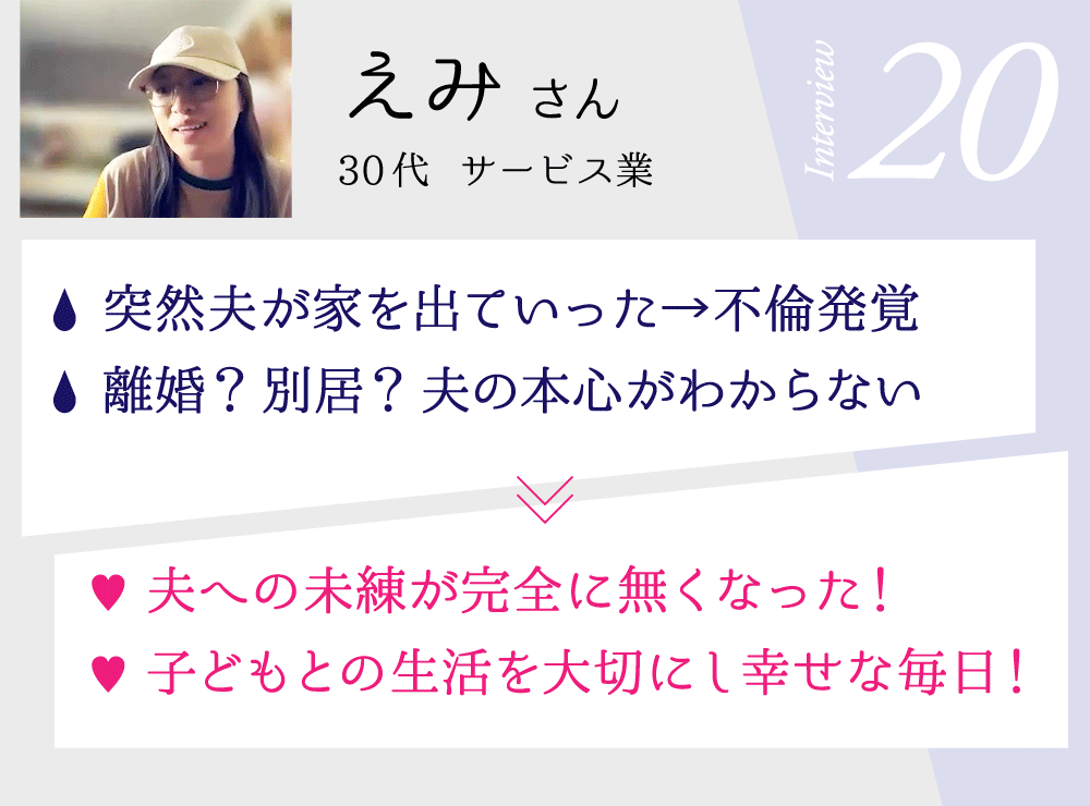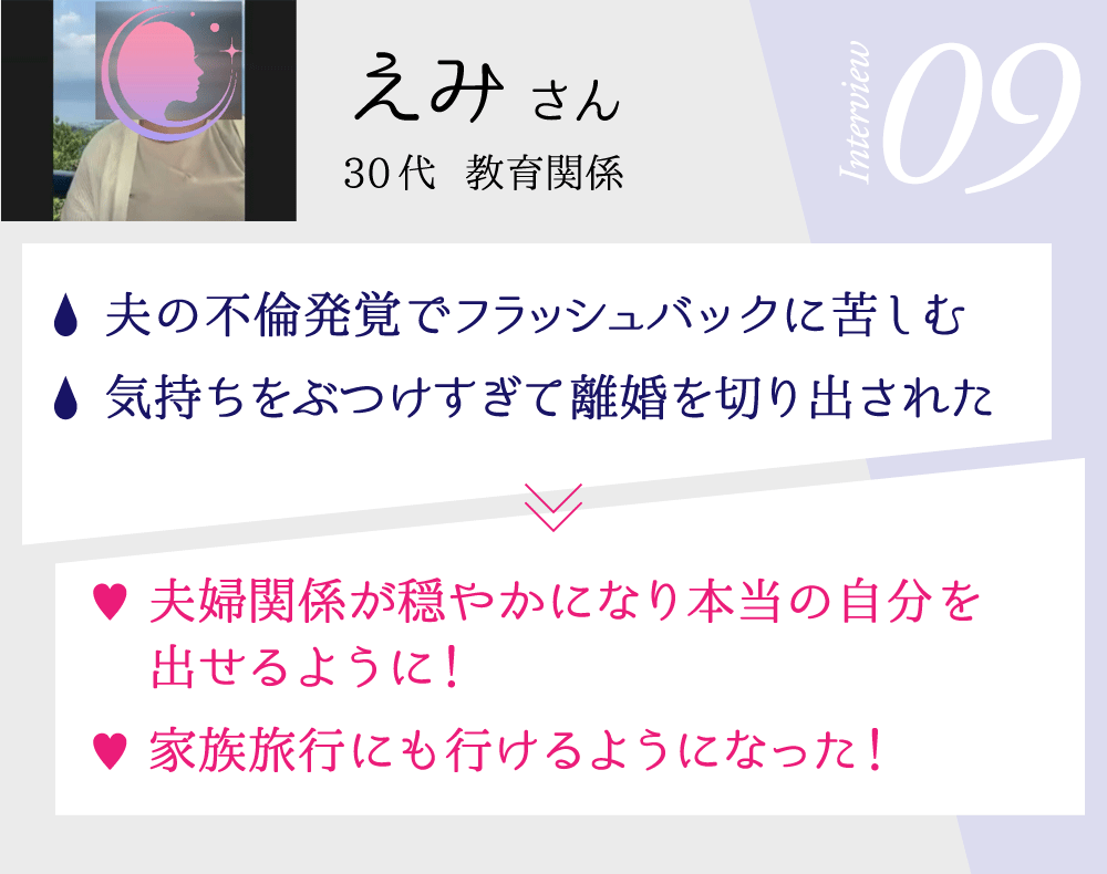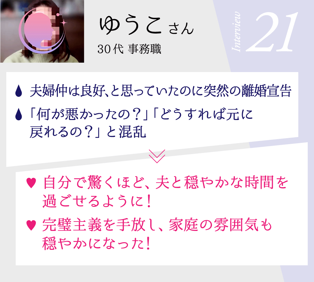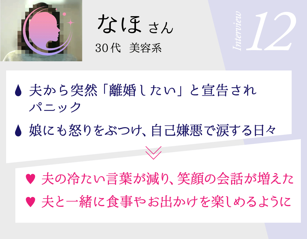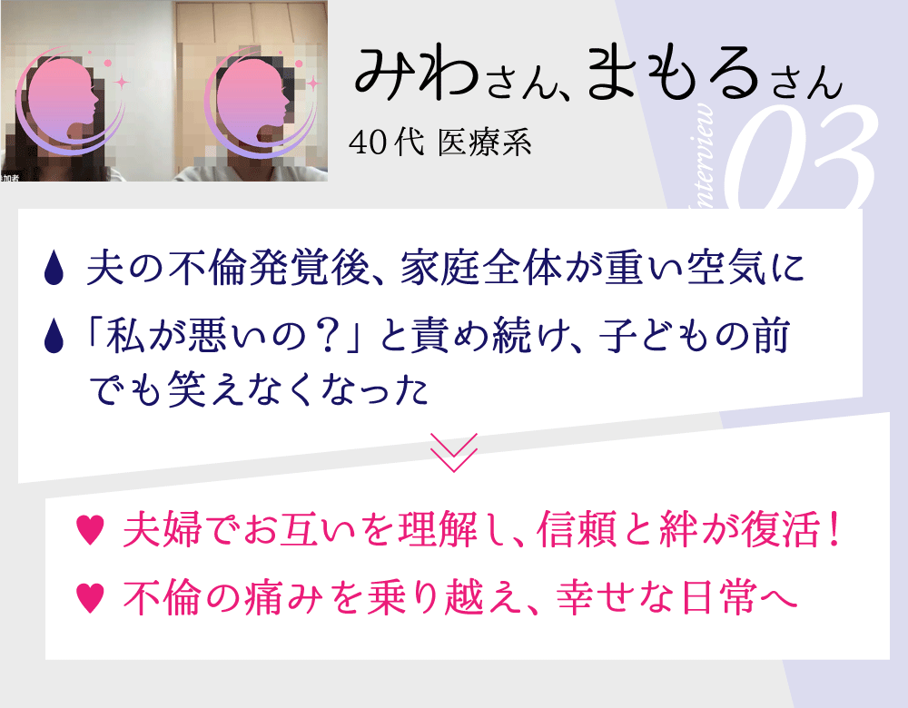 別居・不倫・離婚危機など、深刻な状況からの再構築に成功した事例が多数。