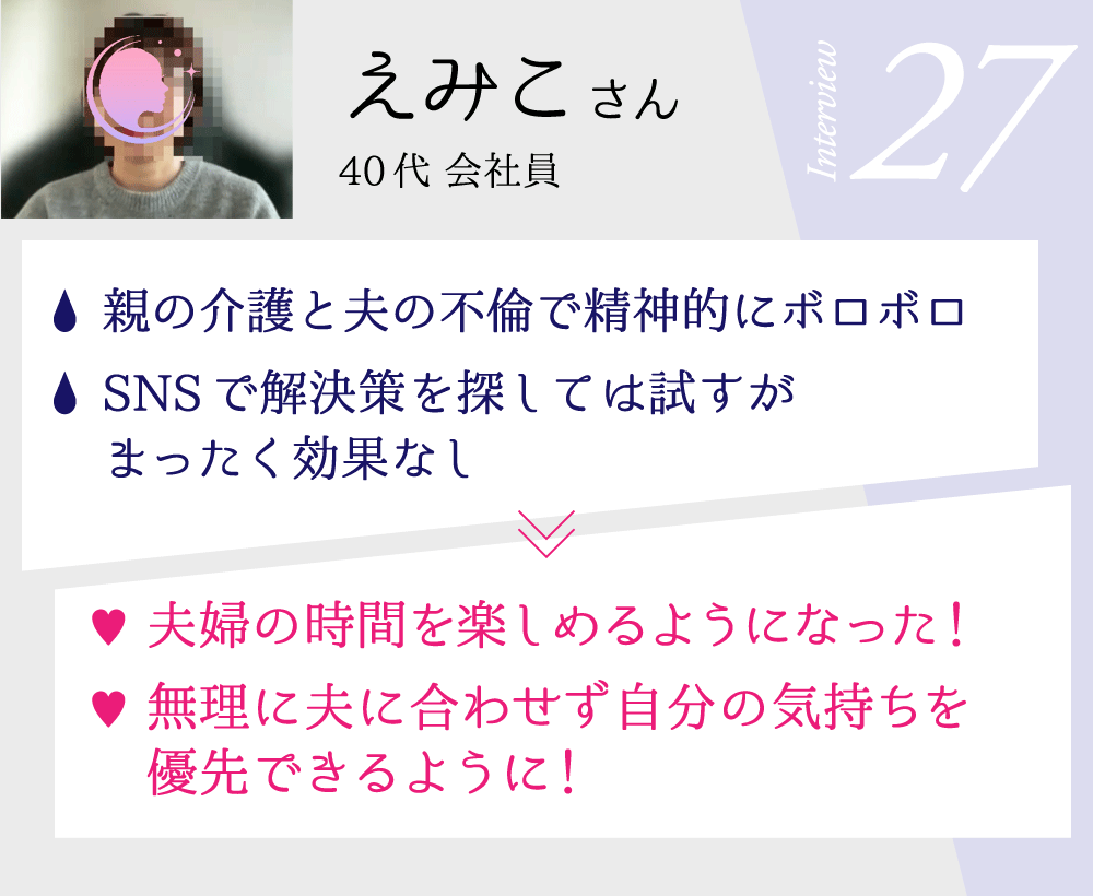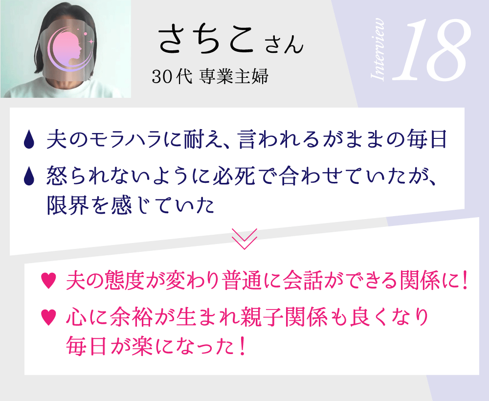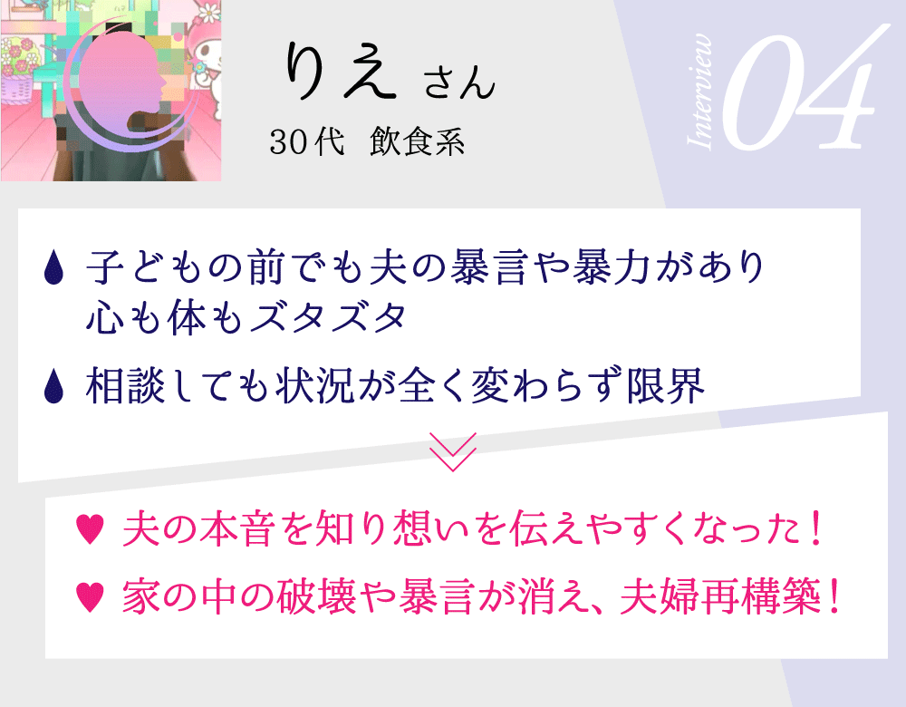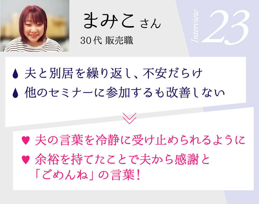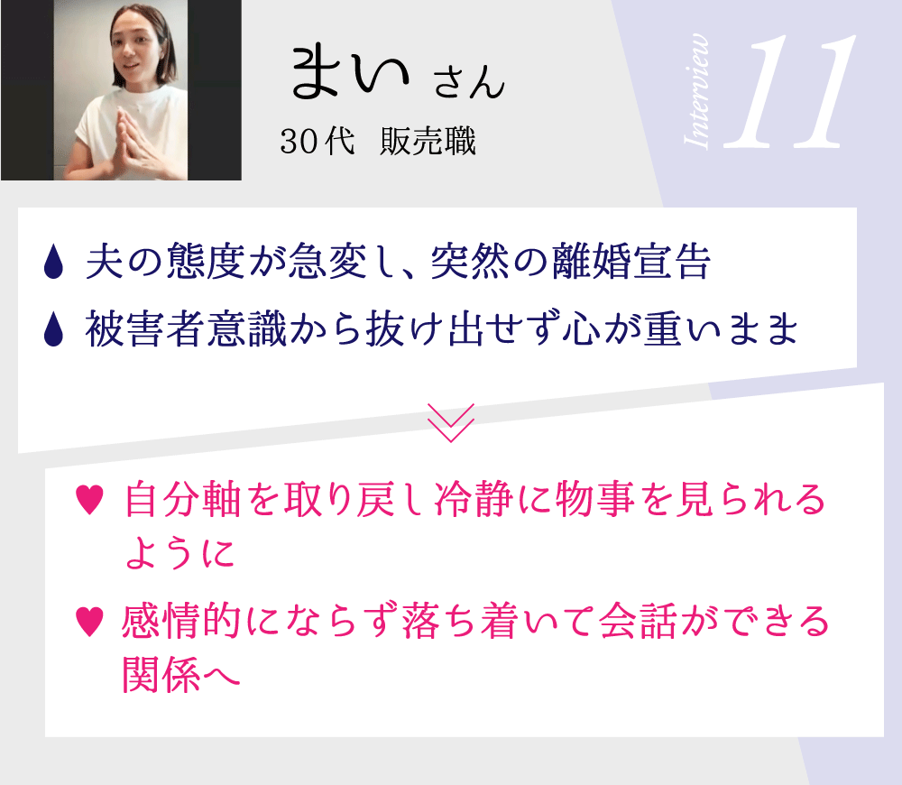 別居・不倫・離婚危機など、深刻な状況からの再構築に成功した事例が多数。