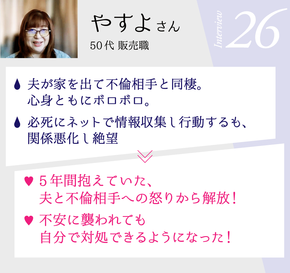 自身も夫の不倫・別居・嫁姑問題という「どん底」を経験。